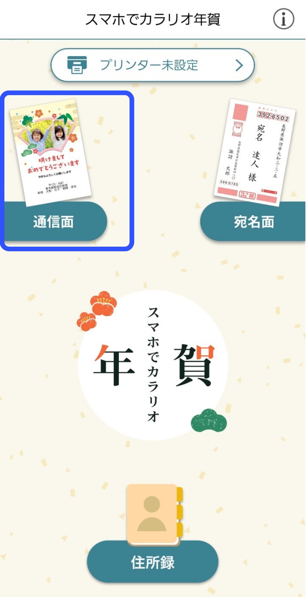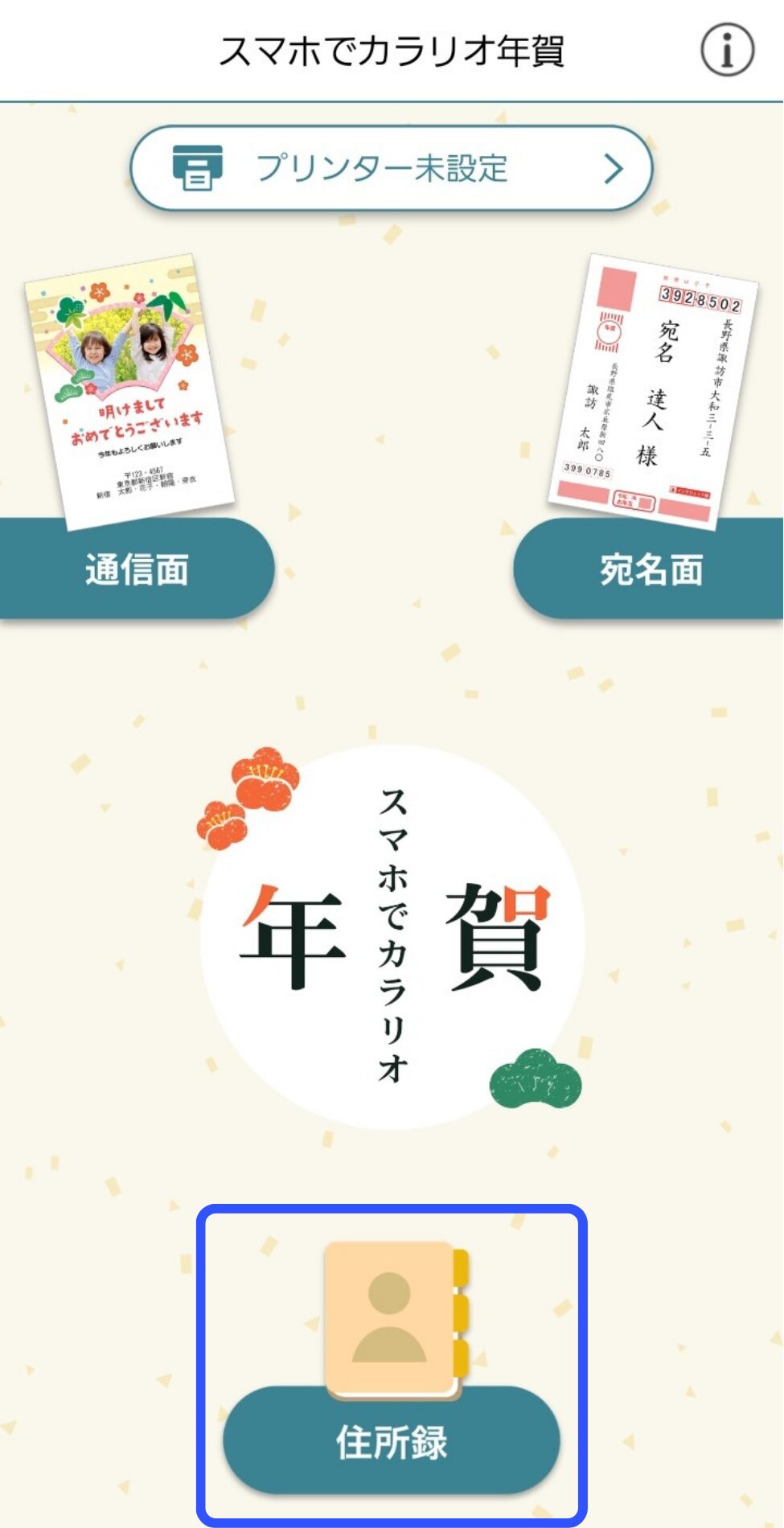 スマホで作成する場合は、スマホ用のアプリ「スマホでカラリオ年賀」を使います。