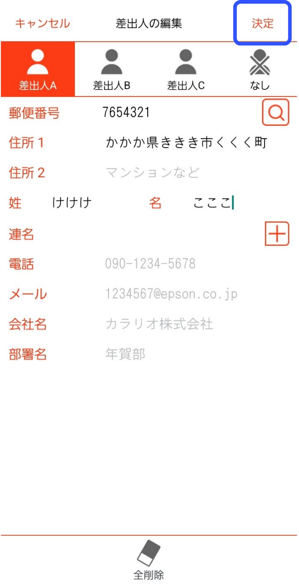 差出人情報を宛名面に印刷する場合は、差出人枠に入力します。