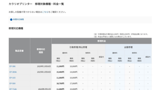 交換料金はエプソン公式サイトの「修理対象機種・料金一覧」で確認することができます。